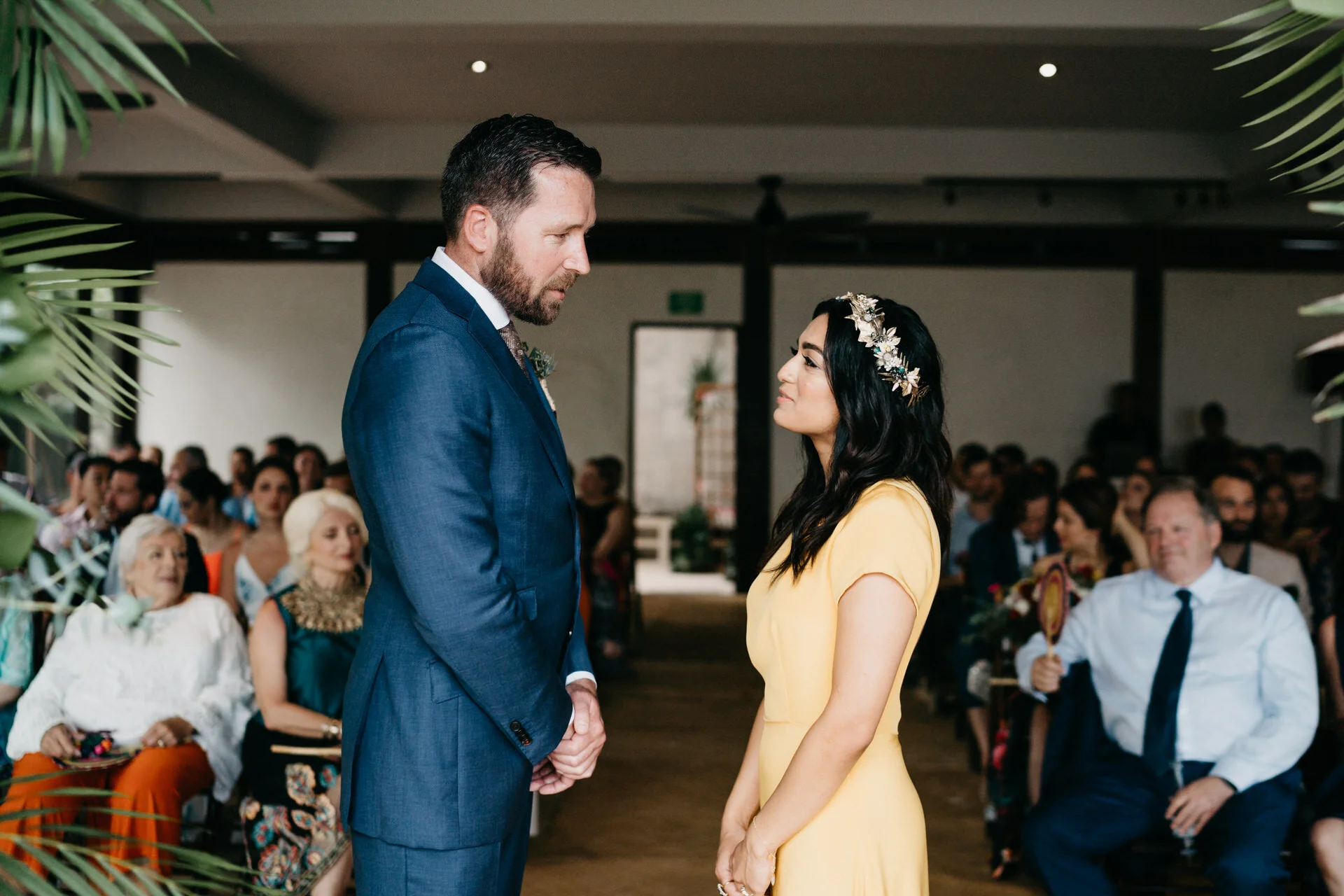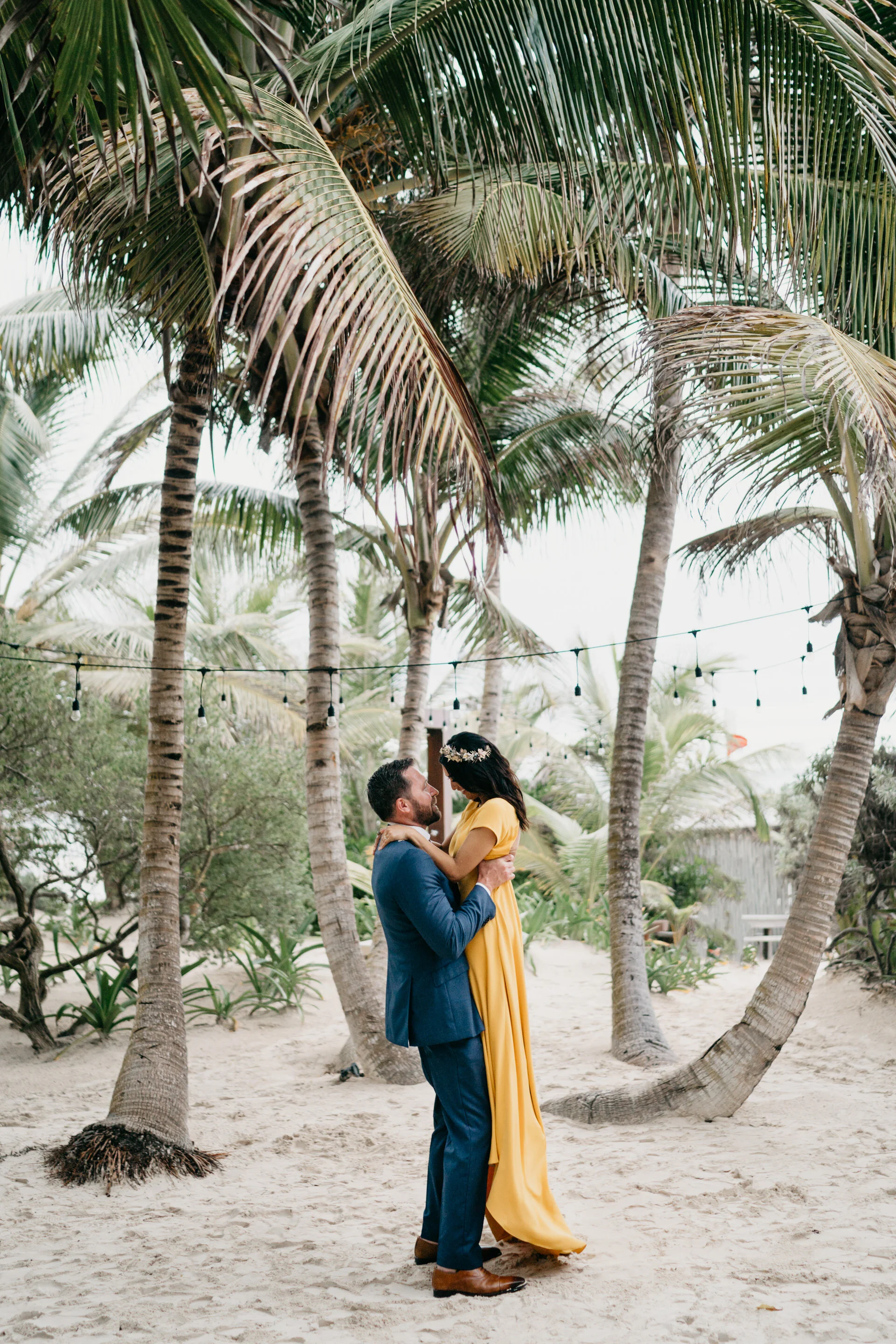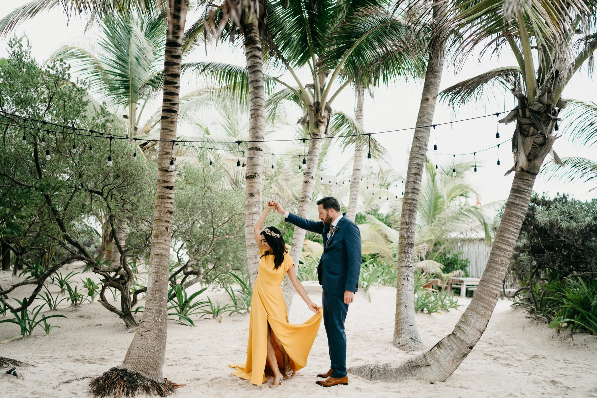 We have to talk about Iqra and Dave’s epic wedding in Tulum if you want to see a nontraditional wedding! This chill-fun couple traded tradition for a ceremony in a beach-front yoga studio in the iconic Sanará Hotel in Tulum! There are few brides who can pull off wearing the yellow Sarah Seven wedding dress and definitely Iqra is one of them! Situated between the tropical jungle and turquoise waters, this eco-boutique hotel was the perfect spot to celebrate their love. This fun-loving couple traded a traditional wedding for a ceremony in a beach-front yoga studio at Sanara.